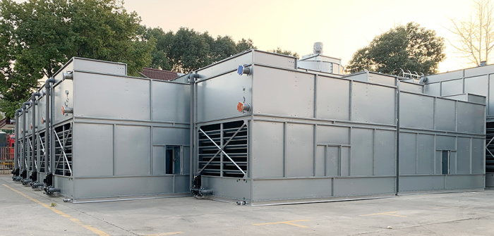 横流闭式冷却塔:空气与喷淋水横向流动,空气由换热管束侧面进入,喷淋水由上部喷洒而下,它们成横向交叉90度角形式。