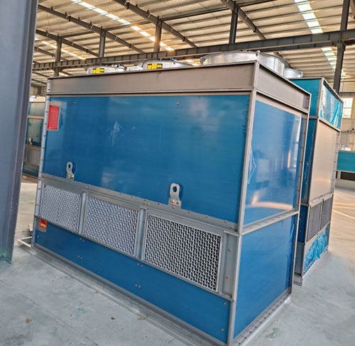 横流闭式冷却塔:空气与喷淋水横向流动,空气由换热管束侧面进入,喷淋水由上部喷洒而下,它们成横向交叉90度角形式。