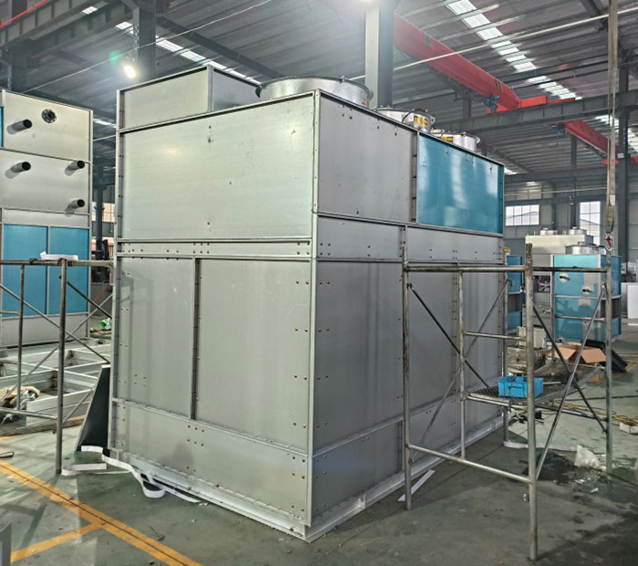 横流闭式冷却塔:空气与喷淋水横向流动,空气由换热管束侧面进入,喷淋水由上部喷洒而下,它们成横向交叉90度角形式。